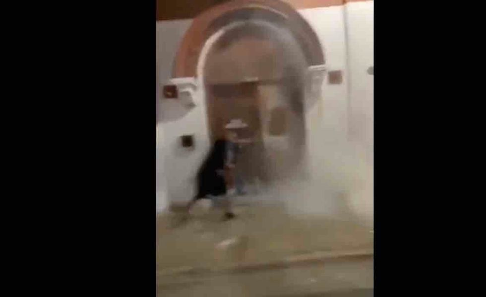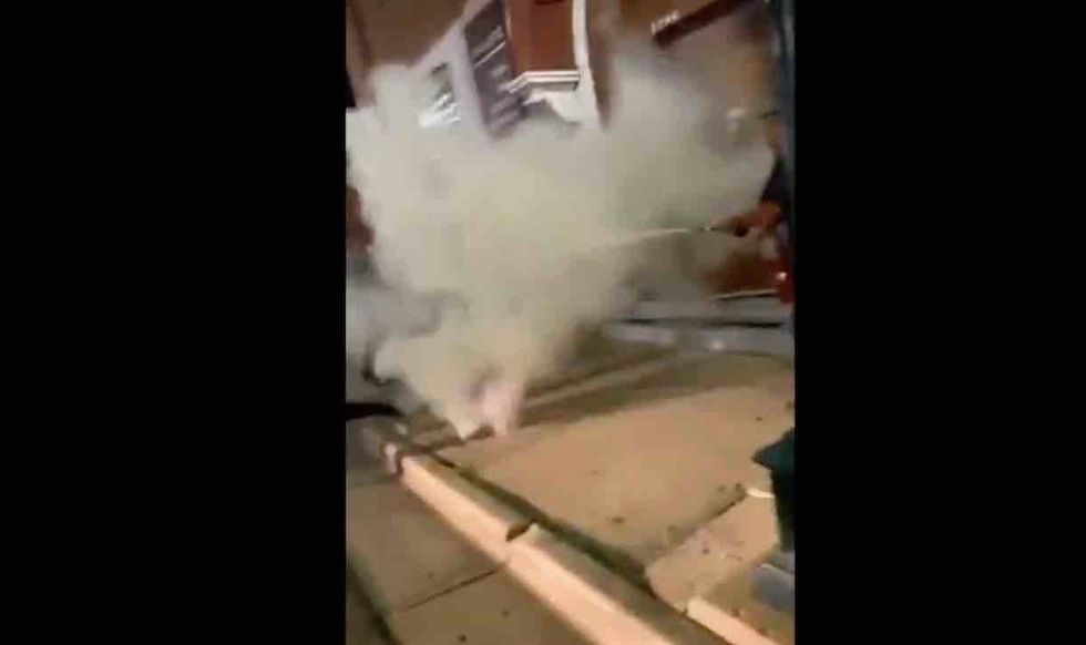 He begins spraying the extinguisher at the looters in an apparent attempt to fight back: