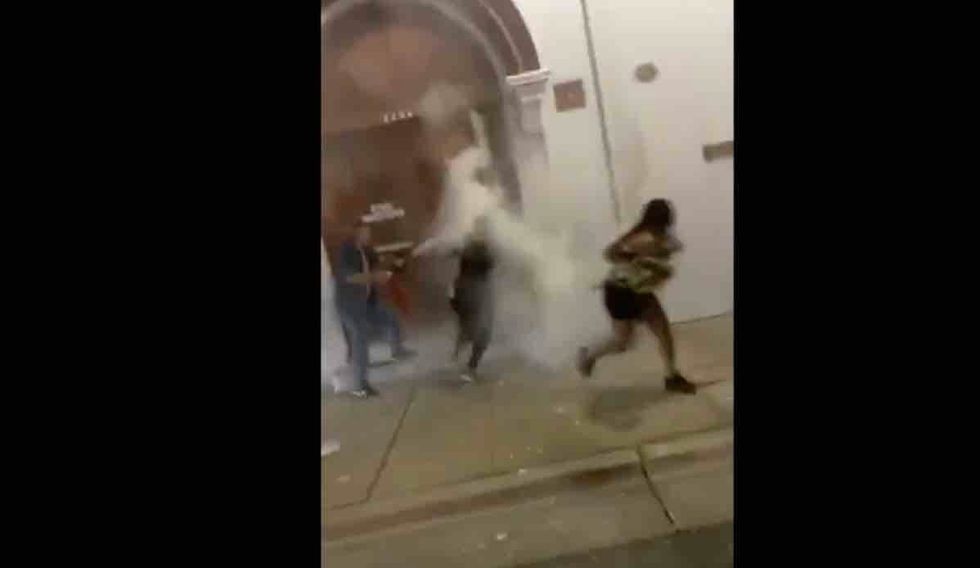 And that's when a rioting thug is seen running up to the elderly man and attacking him and knocking him down, as he literally rolls off the store entrance steps to the sidewalk: