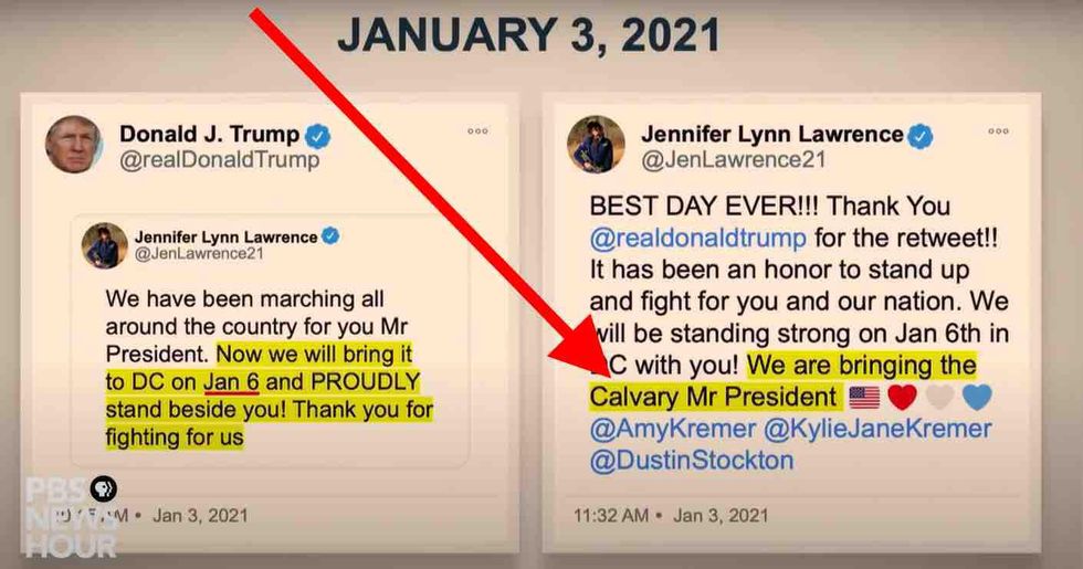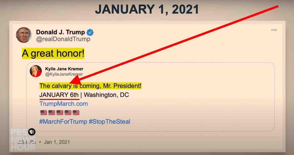 During the hearing Swalwell also flashed an image of a post from another Twitter user — Kylie Jane Kremer — and also misquoted it. Yes, you guessed it: Kremer's written phrase reads, "The calvary is coming, Mr. President!" Yet Swalwell stated "cavalry."