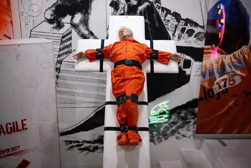 A UK provocateur's sculpture of a crucified Trump was installed in a Swiss city's downtown.