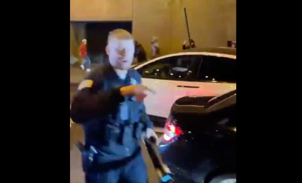 After the sideswipe, folks are seen running after the Tesla before a police officer suddenly appears and tells the foaming-at-the-mouth attackers to "back up!"