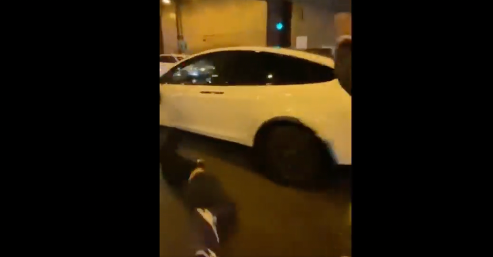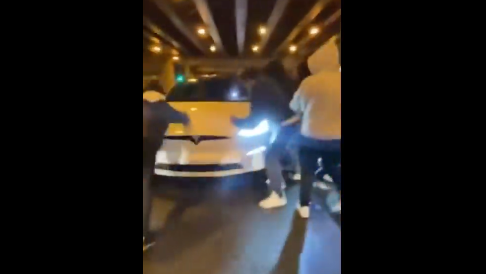 As militant leftists tend to do, they chased after the Tesla — which by that point had sustained damage to its driver-side mirror — and pounded and kicked the vehicle some more while a female hollered, "F*** this car up!" and another yelled, "What the f***, bro!"