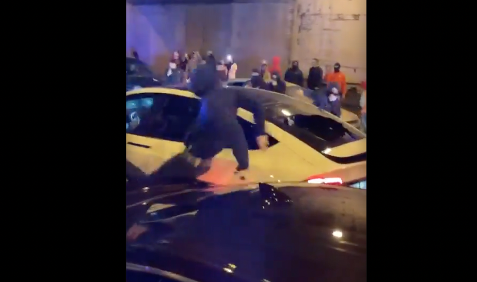 A Chicago street takeover took a scary turn over the weekend when individuals were caught on video appearing to trap a white Tesla on Lower Wacker Drive — and some even climbed atop the hood to take selfies.