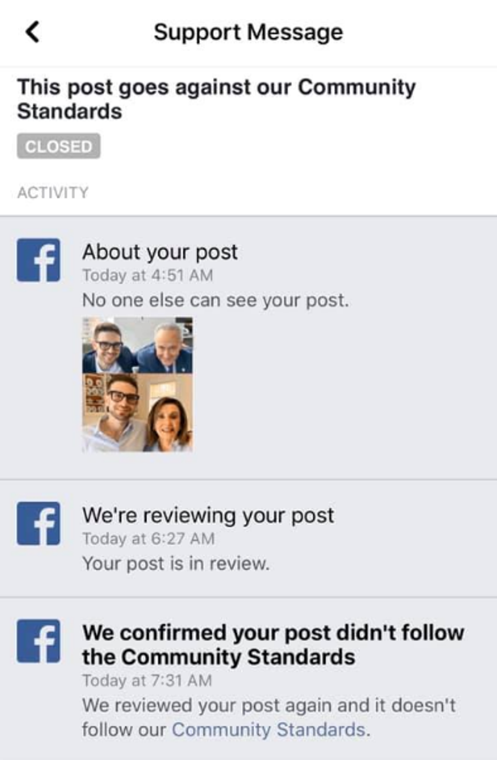 She added, "Facebook has now removed two of my posts without any notice or any sort of communication. I think we have a freedom of speech crisis in America."