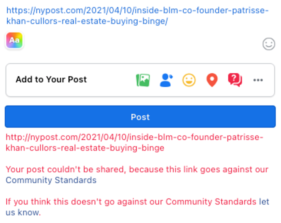 Users on the platform reported Thursday that they weren't able to share the link to a story, published by the Post, that detailed Black Lives Matter co-founder Patrisse Khan-Cullors' recent multimillion-dollar "real estate buying binge."