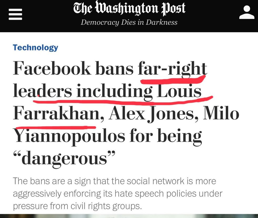 The Washington Post version of this story initially, and erroneously, listed Farrakhan as being "far right." The headline has since been updated, but a screenshot of the original headline can be viewed below, with words underlined for emphasis.