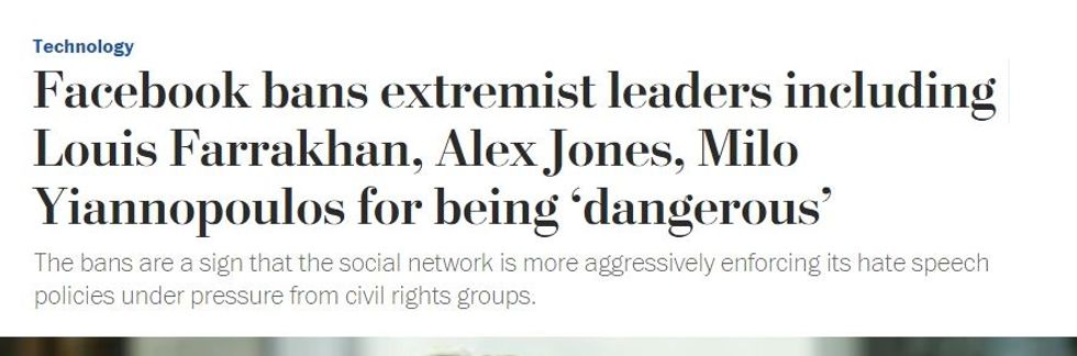The updated headline reads "Facebook bans extremist leaders including Louis Farrakhan, Alex Jones, Milo Yiannopoulos for being 'dangerous'."