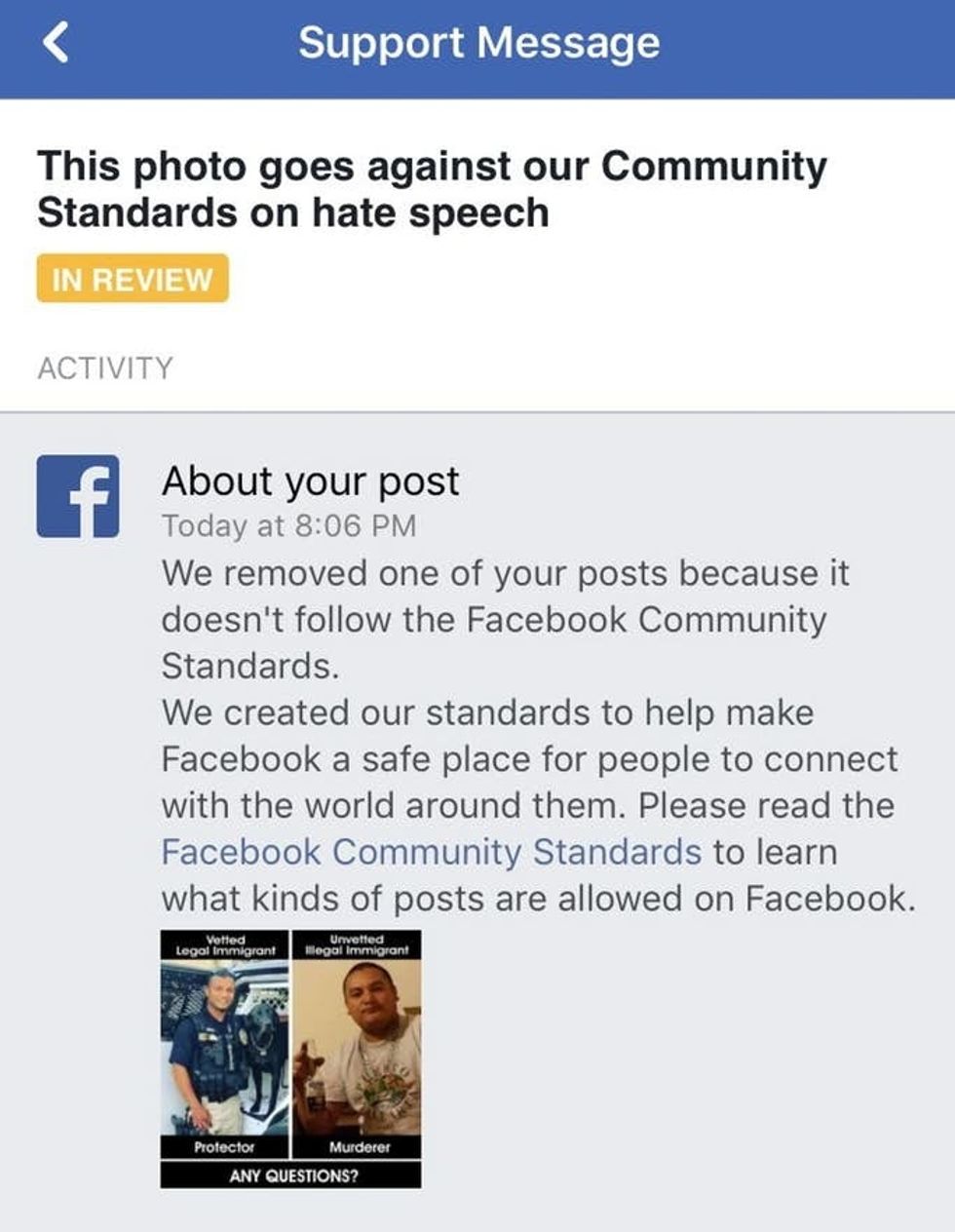 According to Blue Lives Matter, Facebook has informed multiple users that posts declaring "Arriaga" to be an "illegal immigrant" or "illegal alien" violate the platform's community rules for "hate speech."