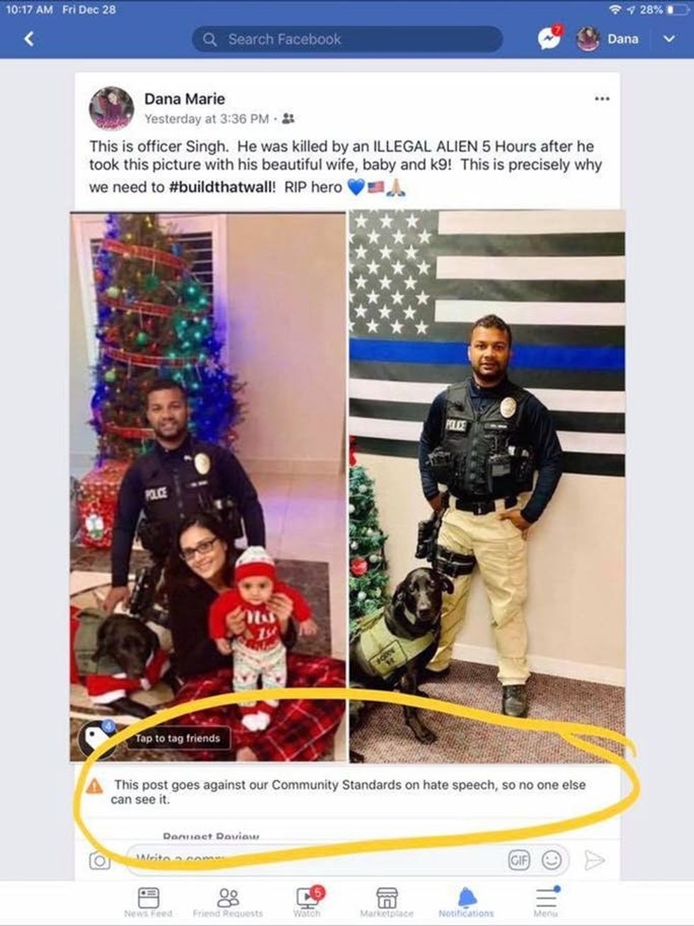 Meanwhile, another Facebook user who posted Singh's picture and referred to Arriaga as an "illegal alien" — a standard phrase used to refer to illegal immigrants — was similarly reprimanded for "hate speech."