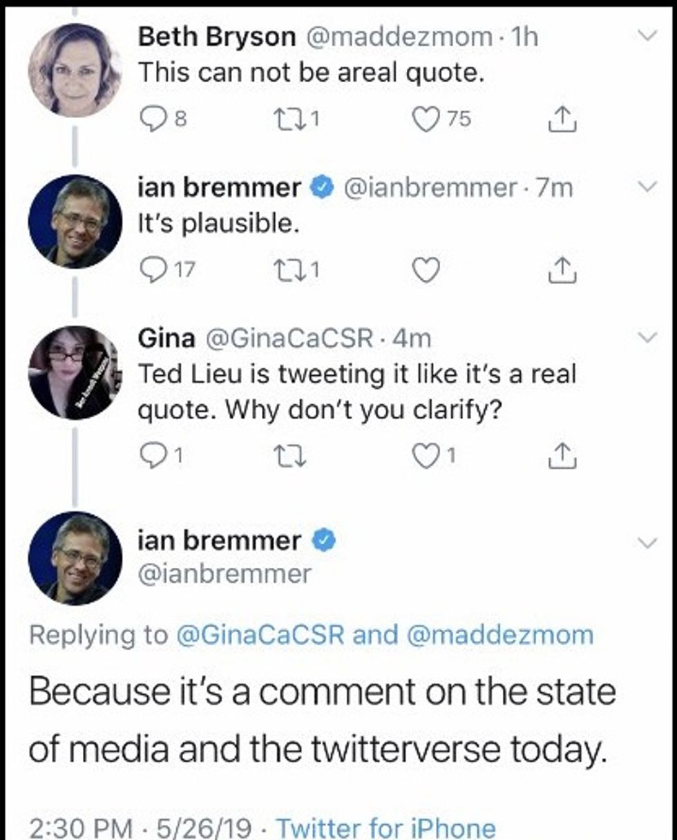 The lesson here is not the one Bremmer intended, though it's close. He seems to think he taught everyone how plausible his fake quote is. But in reality, what he instructed was "Don't trust Ian Bremmer.