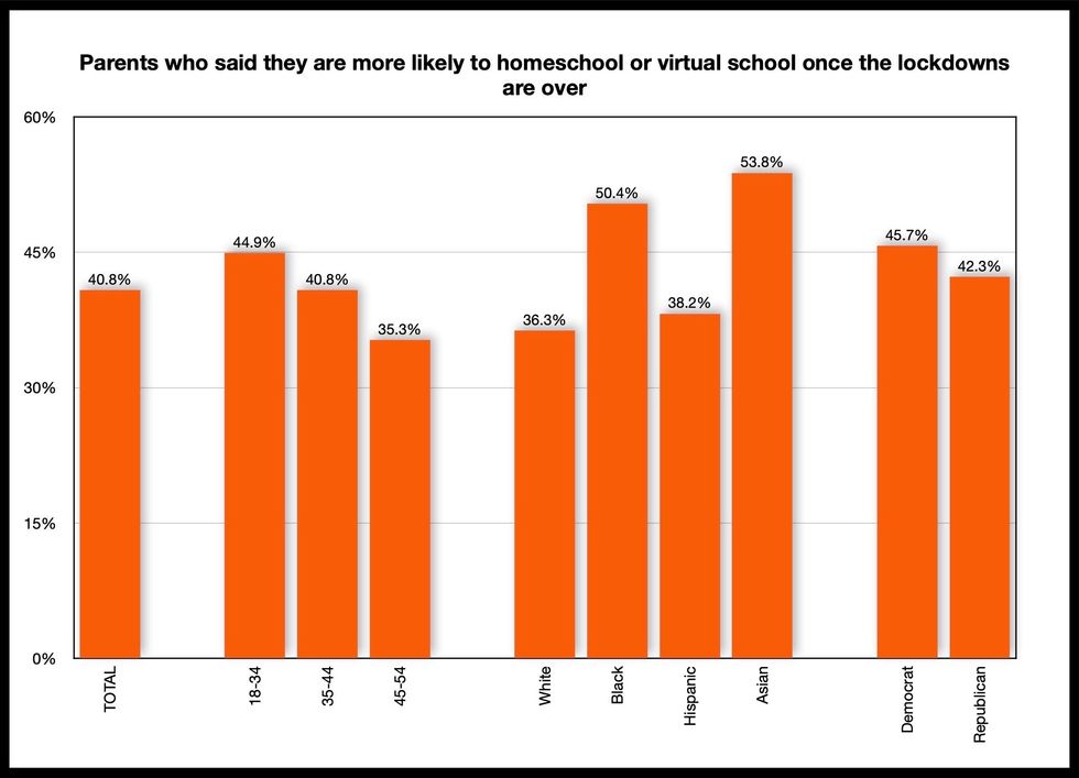 Democrats (45.7%) were slightly more likely than Republicans (42.3%) to say homeschooling is an increasingly possible option for their kids once the lockdowns conclude.