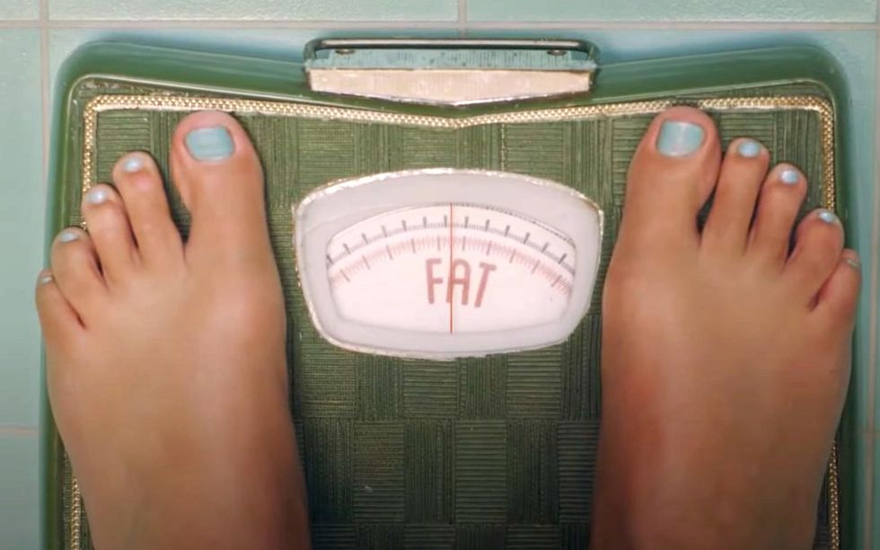 The scene from her song "Anti-Hero" shows the singer weighing herself on a scale and looking at the display that reads "fat."