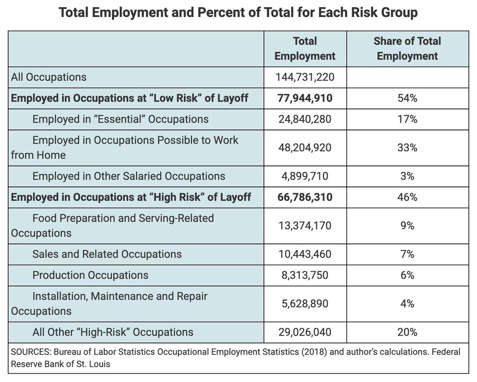 He found that 46% of workers appear to be in "high risk of layoff" jobs. Not surprisingly, the largest share (9%) of those jobs are in food prep or serving-related business; followed closely by jobs in sales (7%) — mostly retail workers.