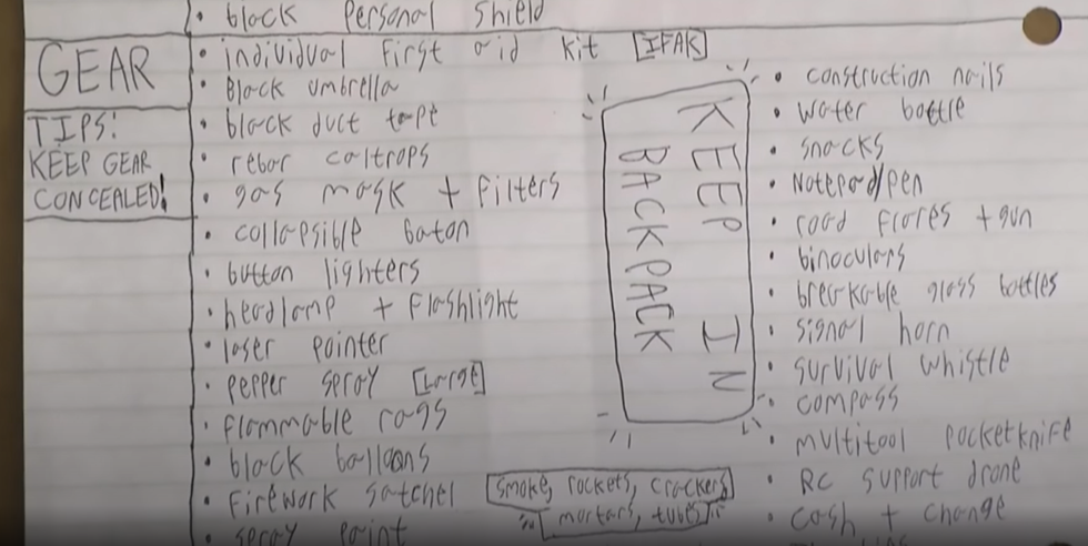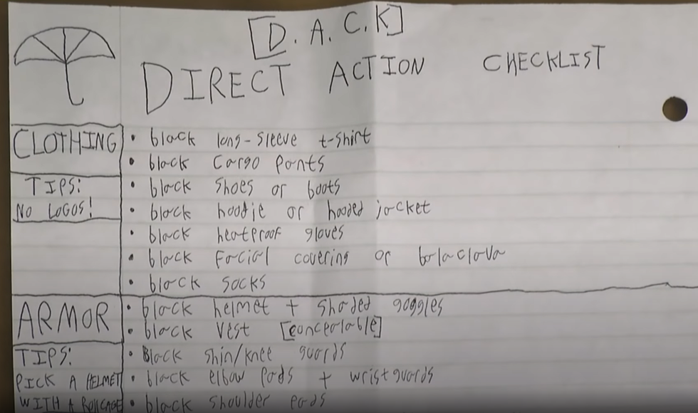 The list recommended wearing all black clothing, a balaclava, gloves, a black helmet, shaded goggles, a gas mask, knee pads, elbow pads, a sports chest plate, and a personal shield. The checklist also listed other questionable items such as smoke rockets, zip ties, duct tape, a black umbrella, black balloons, flammable rags, matches, a slingshot, pepper spray, a collapsible baton, construction nails, laser pointer, road flares, and binoculars.