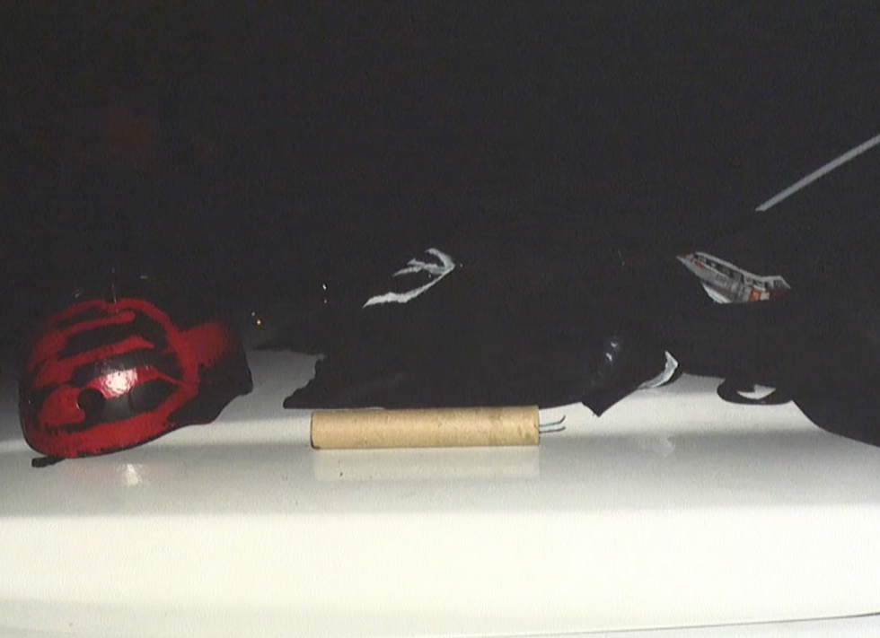 The helmet appeared to have three red arrows with a circle around them painted on it.