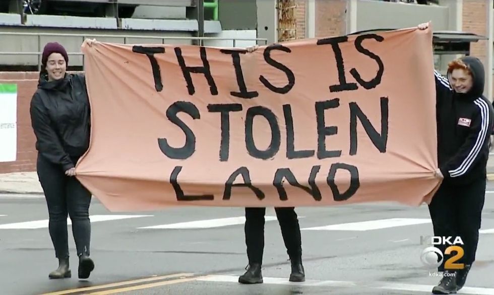 Shortly after the parade began, protesters with a banner reading "THIS IS STOLEN LAND" jumped in front of the parade route, KDKA-TV reported in a follow-up piece.