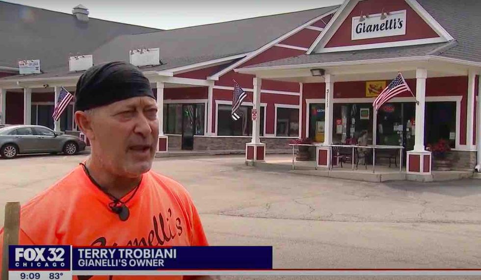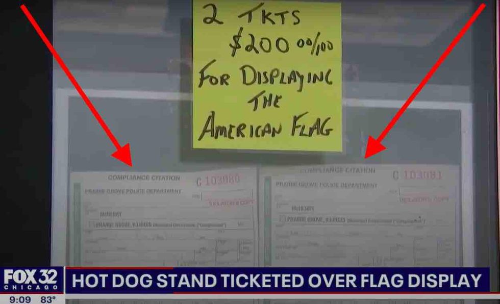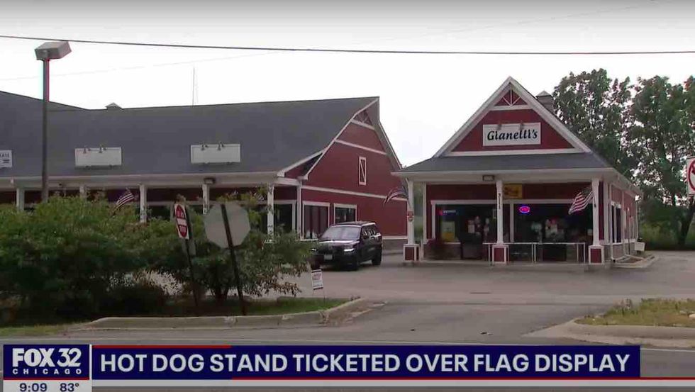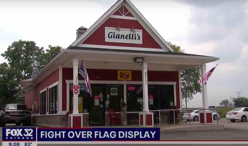Terry Trobiani told WFLD-TV he just wanted to celebrate this past Fourth of July by placing two American flags on the front of Gianelli's, his hot dog and beef restaurant along Highway 176 in Prairie Grove, Illinois.