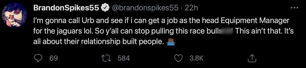 He later added, "I'm gonna call Urb and see if i can get a job as the head Equipment Manager for the jaguars lol. So y'all can stop pulling this race bulls**t! This ain't that. It's all about their relationship built people."