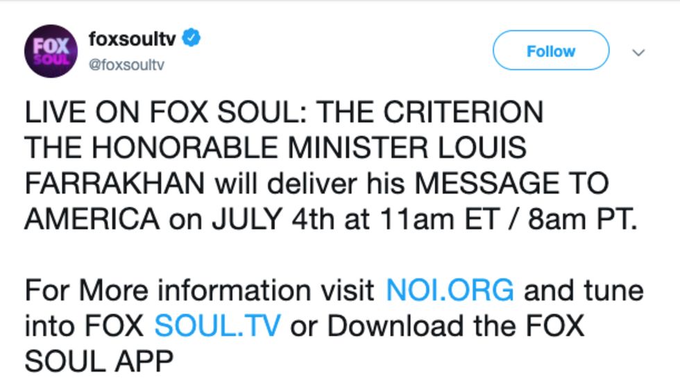 In a since-deleted tweet, Fox Soul wrote, "LIVE ON FOX SOUL: THE CRITERION THE HONORABLE MINISTER LOUIS FARRAKHAN will deliver his MESSAGE TO AMERICA on JULY 4th at 11 am ET/8 AM PT."