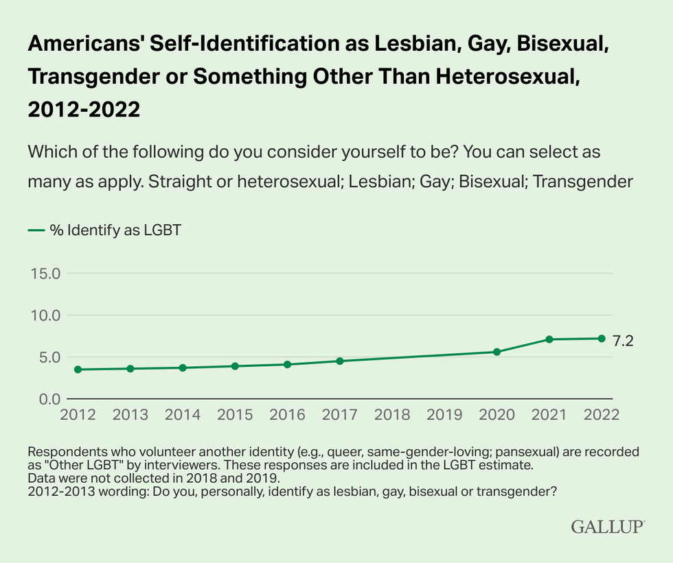 The new poll shows that 7.2% of those surveyed identified as LGBT in 2022; this number equates to 720 people out of 10,000 who were asked.