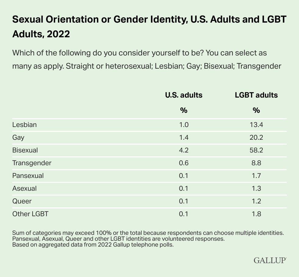 According to Gallup, it is "typical" that the majority of non-heterosexuals identify as "bisexual." Bisexuals represent 4.2% of the overall population.