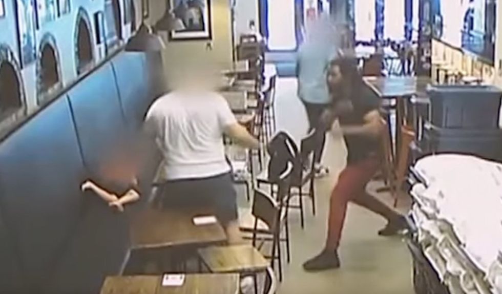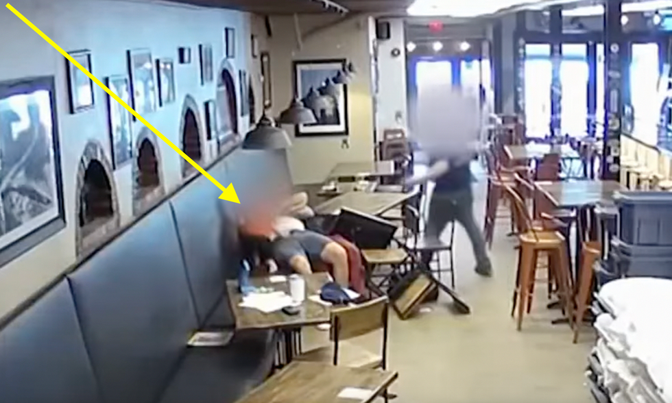 Gunman (right) attacked Washington, D.C., pub owner (middle) in front of pub owner's 4-year-old son (left) June 29. (Image source: YouTube screenshot)