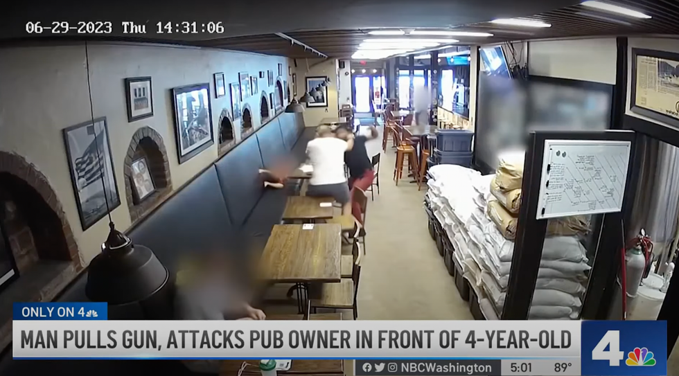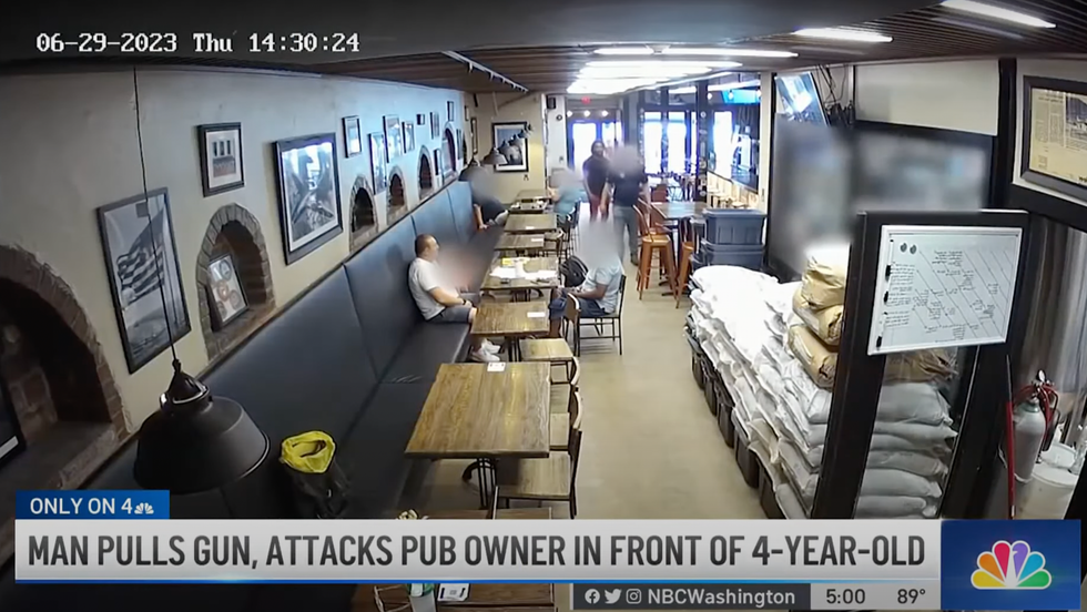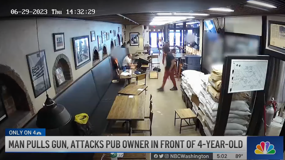 Surveillance video caught the scary scene as a gunman walked into a Washington, D.C., pub one afternoon late last month and attacked the owner in front of his 4-year-old son, WRC-TV reported.