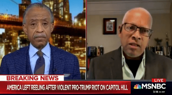 "Rev. Al, when they finally got us out of there, we walked past spread-eagled rioters on the floor at gunpoint by the Capitol Hill police officers as we went down the steps. They had us surrounded up there on the third floor. And if that police officer had not fired and stopped the onslaught in the Speaker's lobby, they would've cut off our escape route," he continued. "They would've had us upstairs, and I have no doubt that some of us who look like me would've been hanging from the railings of the third floor, onto the House floor, swinging like ... strange fruit. We would've been swinging from those railings."