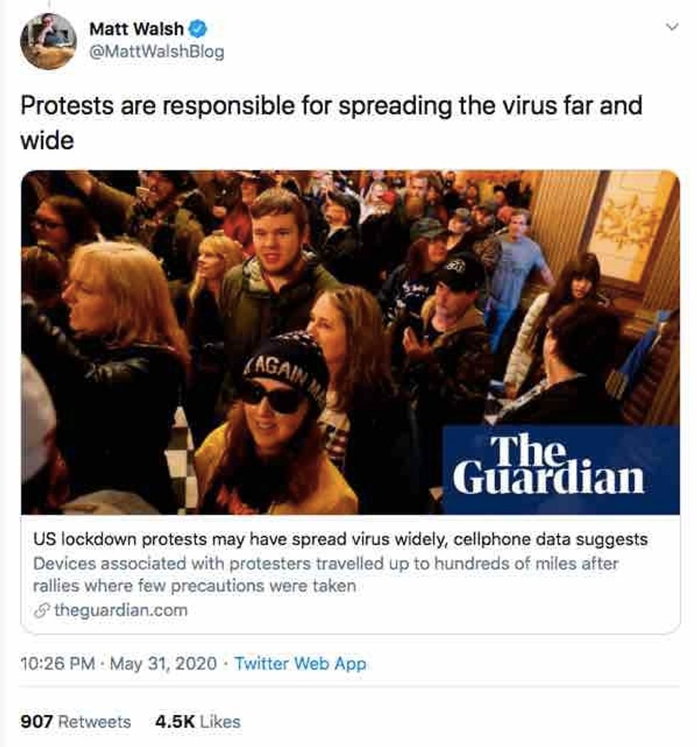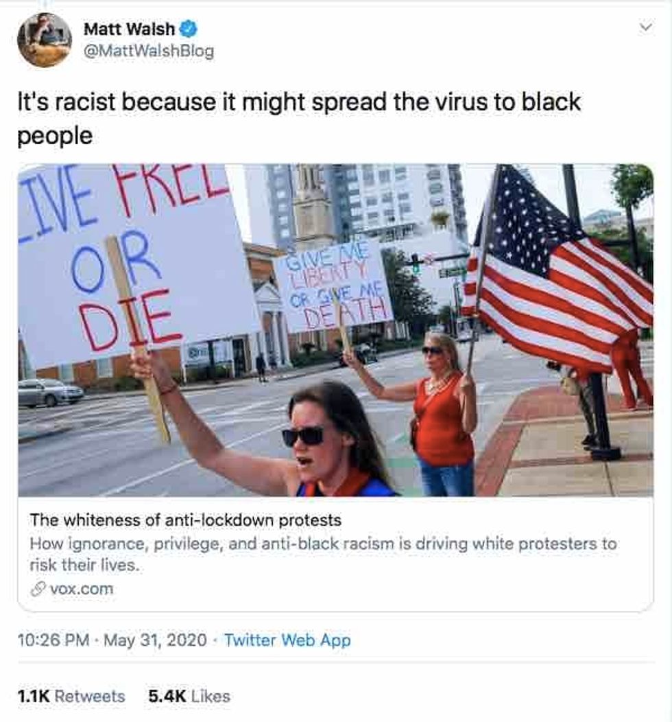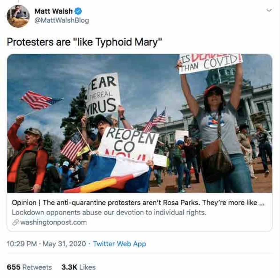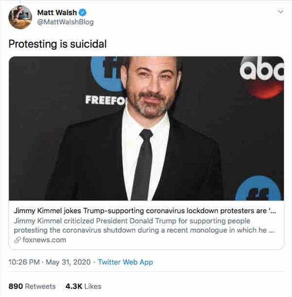 Matt Walsh of the Daily Wire put together a Twitter thread of reaction to recent protests against the coronavirus lockdowns. (Remember those?) It goes without saying that the experts and the powers that be — and that arbiter of all things moral (and blackface wearer) Jimmy Kimmel — weren't too sympathetic to those protesters.