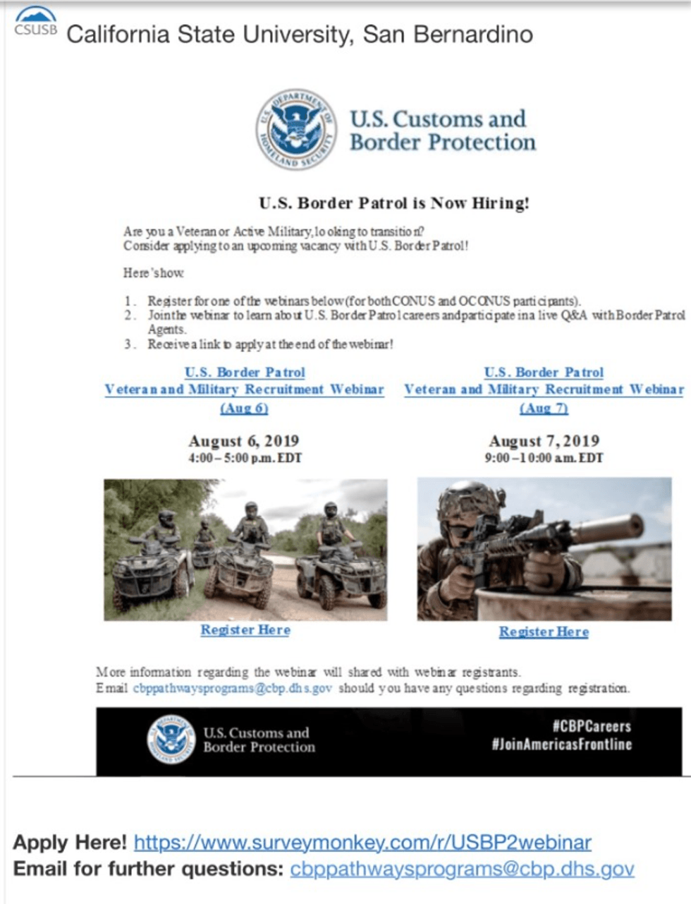 According to documents provided to TheBlaze by Turning Point USA, CSUSB's career center sent out a flyer from USCBP to students announcing that "U.S. Border Patrol is Now Hiring!" The email advertised two veteran and military recruitment webinars conducted earlier this week.