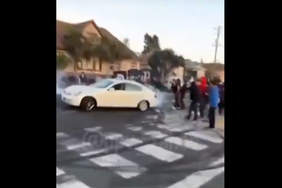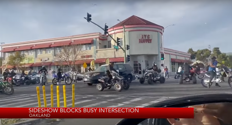 Well, a police vehicle at a different Oakland intersection was recorded on video not dealing with the sideshow participants but instead carefully navigating around them and then leaving the intersection. KTVU said the intersection in question is 42nd Avenue and International Boulevard: