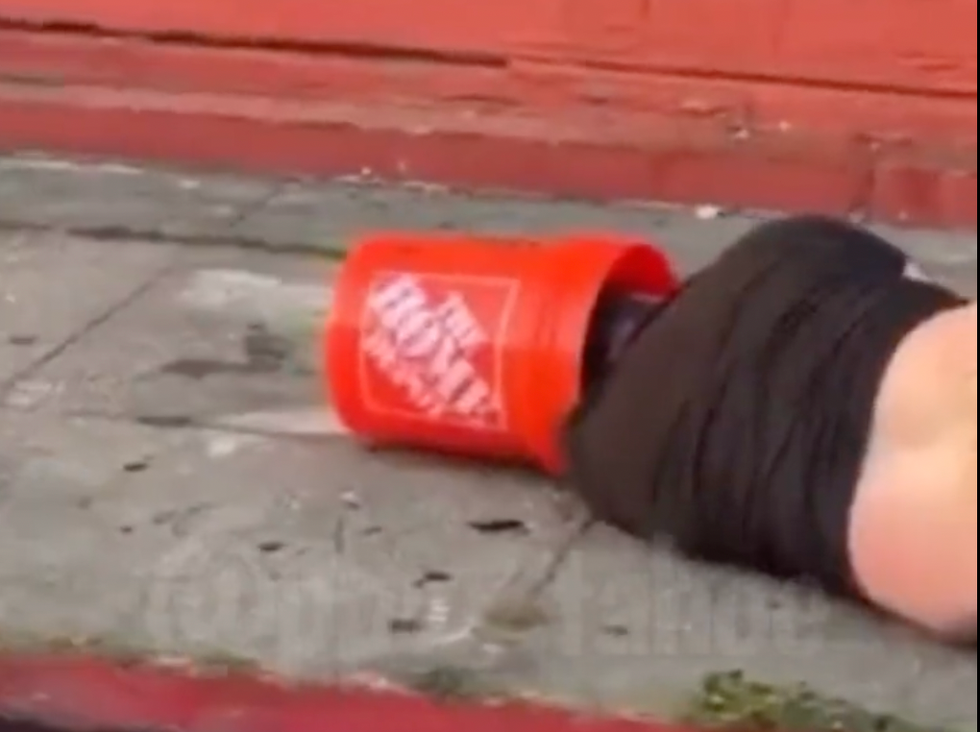 Soon someone yells at the victim, "You got knocked the f*** out!" — and apparently the bucket he originally threw at the car is placed over his head.