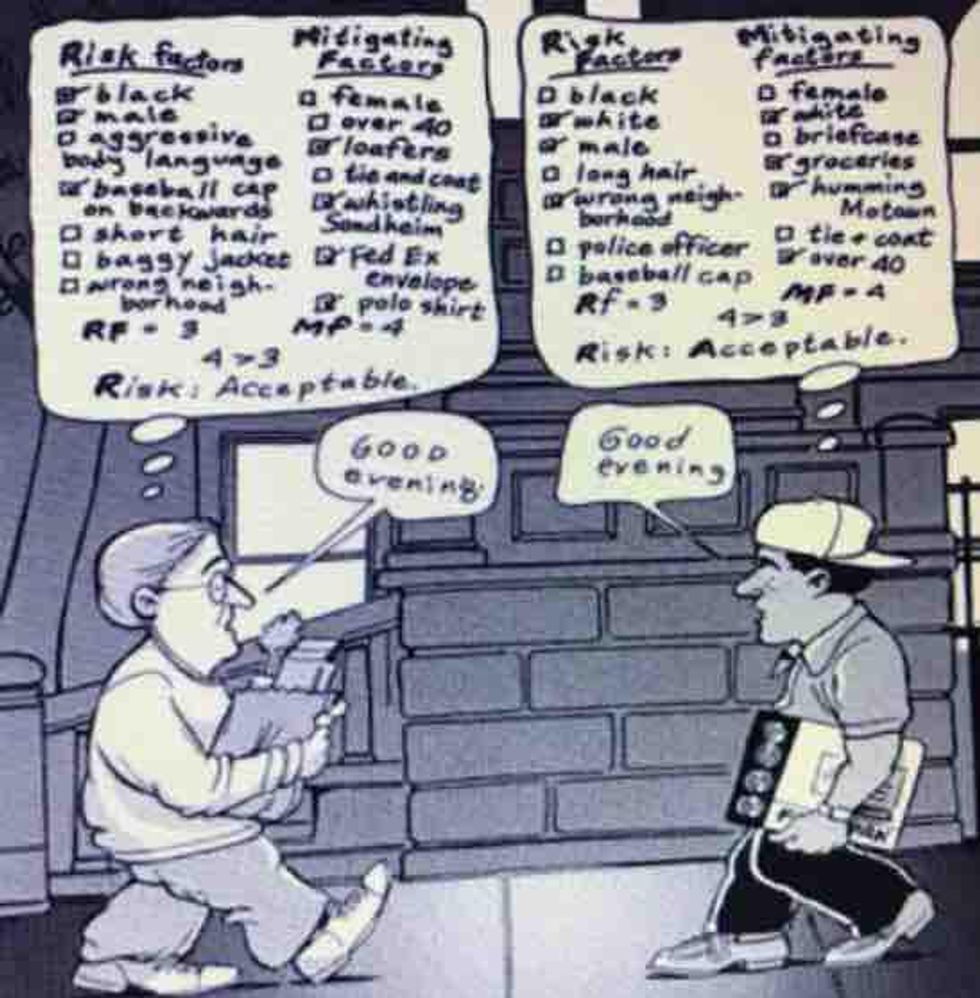 "Instead, the instruction concerned issues of race, gender, stereotypes, prejudices, discrimination, and politics, among others," the lawsuit claims. "In one assignment, Plaintiff's daughter was asked to consider various 'risk factors' and 'mitigating factors' that two people — one identified as 'white' and the other identified as 'black' — purportedly might use to assess each other on a city street. Included among the various factors were skin color, gender, age, physical appearance, and attire. 'Black,' 'aggressive body language' and 'wrong neighborhood' were among the 'risk factors' purportedly assessed by the person identified as 'white.' 'White' and 'Police officer' were among the 'risk factors' purportedly assessed by the person identified as 'black.'"