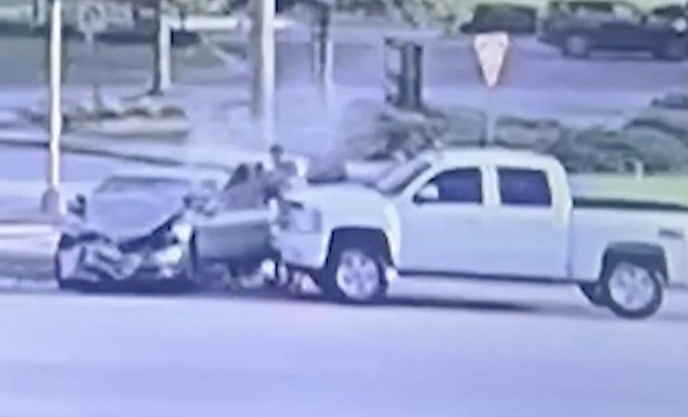 He said a group of football players from the high school "who witnessed the wreck ran to the car and started helping the lady. They literally started using their strength to pry the door open, so the lady could be released. After a few seconds of pulling and pushing the door, the boys ended up opening it and helped her get out of the car."