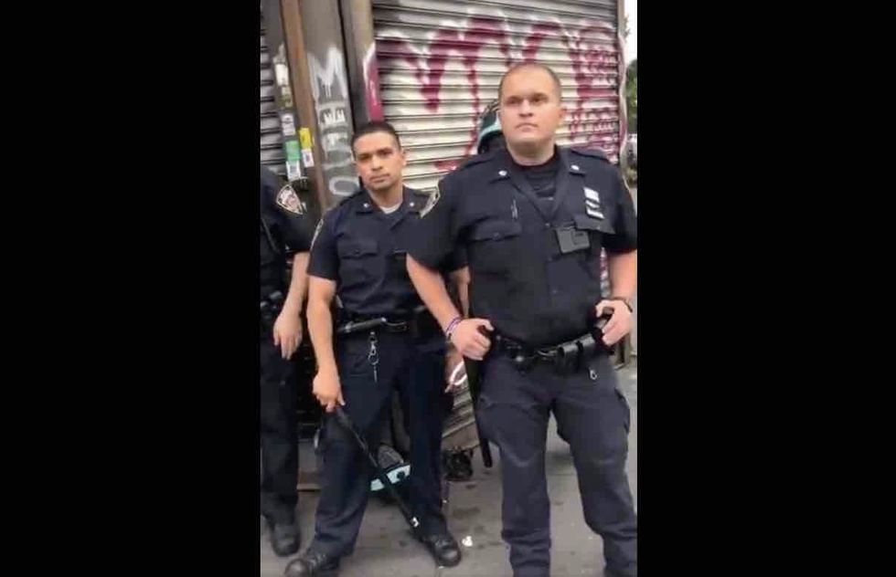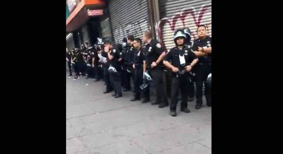 A man apparently took cellphone video of himself traipsing down a New York City sidewalk — with uniformed police officers lined up against a building — and actually started threatening them.