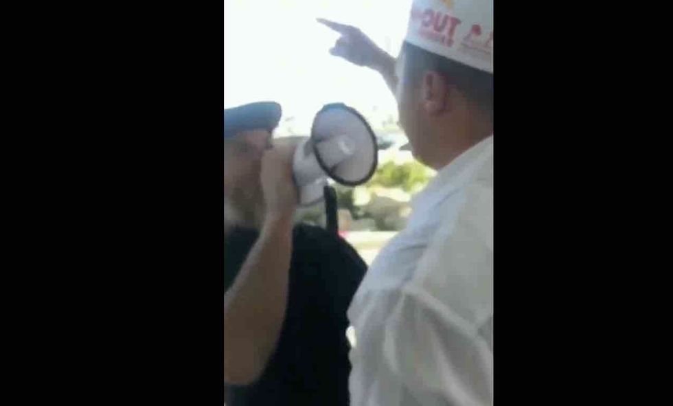 Once out of the restaurant, the protester used his bullhorn to yell "get your hands off me!" in the employee's face, and the employee told the protester to leave the property.