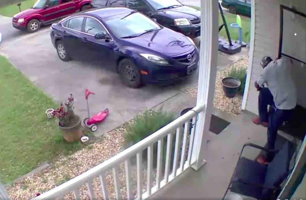 A terrifying home surveillance video shows an incensed man walking up to the front door of a home a few miles north of Pensacola, Florida, last week and beginning to kick in the front door.