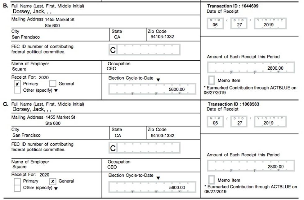 Newly released Federal Election Commission documents show that Dorsey donated $5,600 to Rep. Tulsi Gabbard (D-Hawaii) — $2,800 toward the primary and $2,800 toward the general election, both federal legal maximums — on June 27.