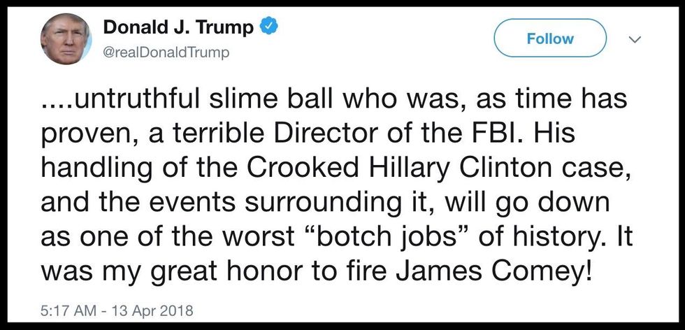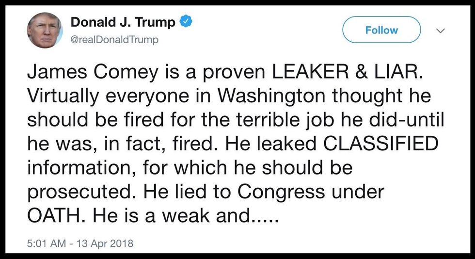 James Comey is a proven LEAKER & LIAR. Virtually everyone in Washington thought he should be fired for the terrible job he did — until he was, in fact, fired. He leaked CLASSIFIED information, for which he should be prosecuted. He lied to Congress under OATH. He is a weak and untruthful slime ball who was, as time has proven, a terrible Director of the FBI. His handling of the Crooked Hillary Clinton case, and the events surrounding it, will go down as one of the worst “botch jobs" of history. It was my great honor to fire James Comey!