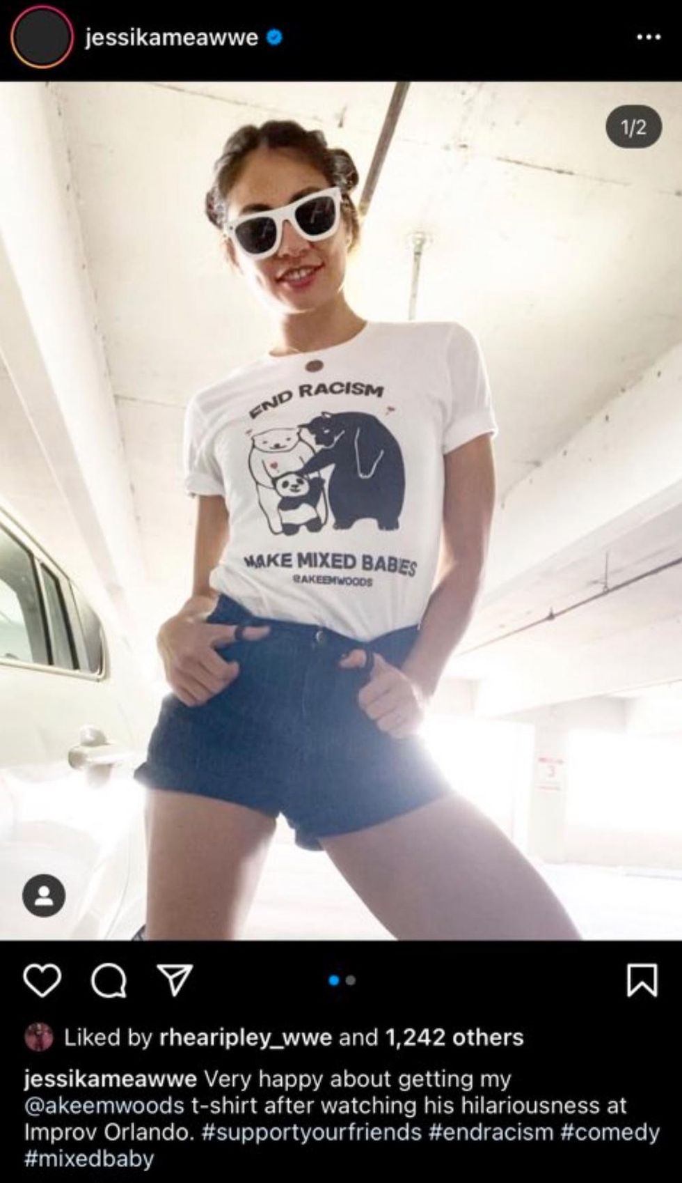 A WWE star apologized after public backlash over her wearing a T-shirt that jokingly offered racial intermixing as the solution to racism.