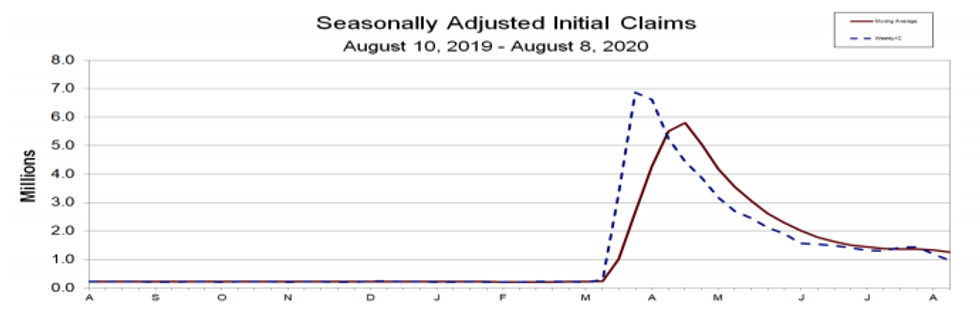 "In the week ending August 8, the advance figure for seasonally adjusted initial claims was 963,000, a decrease of 228,000 from the previous week's revised level," the news release said, adding: "The 4-week moving average was 1,252,750, a decrease of 86,250 from the previous week's revised average."