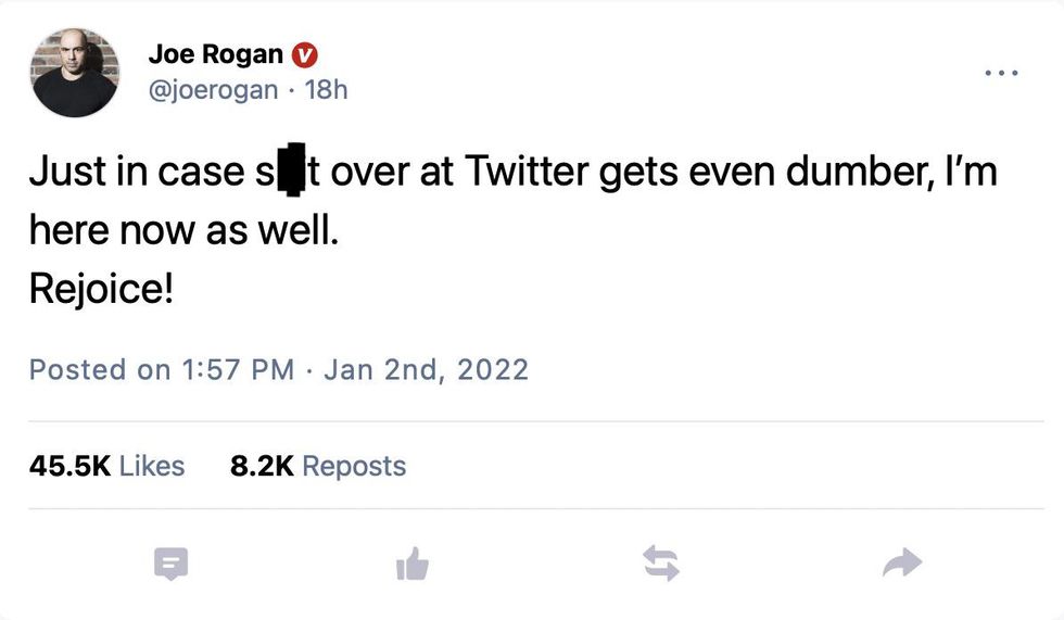 Rogan told fellow GETTR users Sunday, "Just in case s**t over at Twitter gets even dumber, I’m here now as well. Rejoice!"