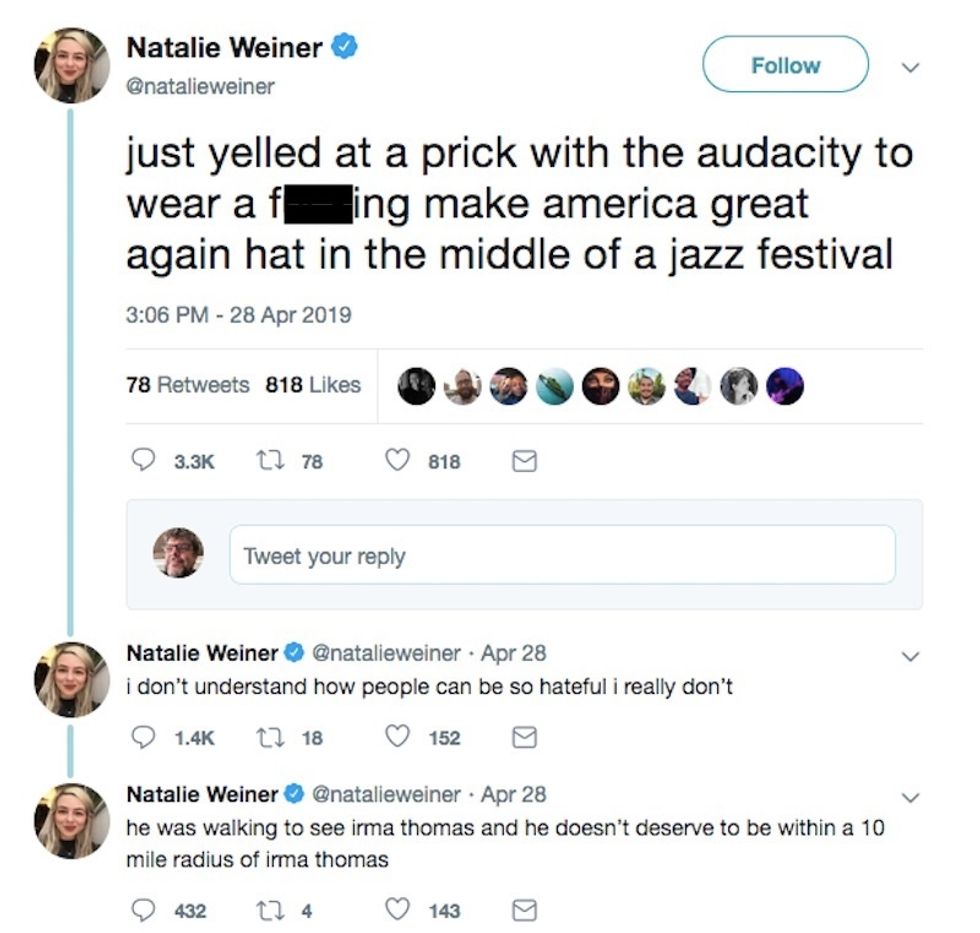 Natalie Weiner, a writer for SBNation, appears to have been attending the New Orleans Jazz & Heritage Festival at the time of her tweet. She added in the thread that the MAGA hat-wearer "doesn't deserve to be within a 10 mile radius" of singer Irma Thomas, who was performing at the festival.