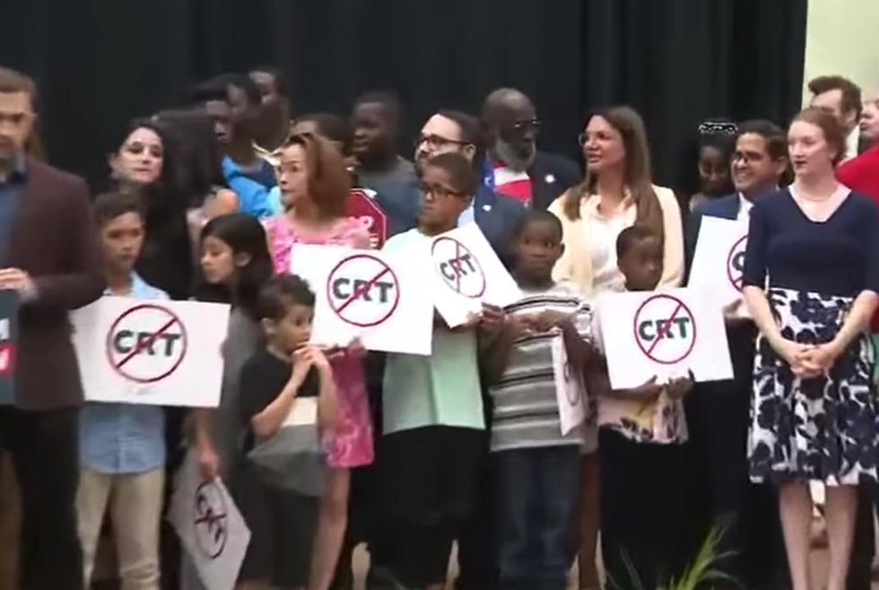 During the bill-signing ceremony, DeSantis was flanked by various students holding "stop woke" and anti-CRT signs.
