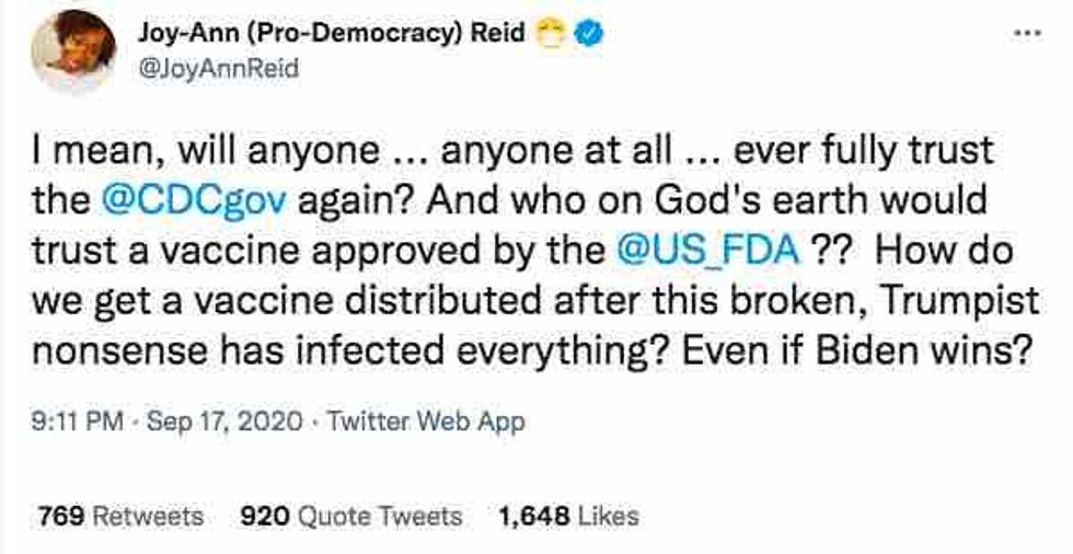 Joy Reid again defends her belief that it was NECESSARY to be anti-vaxxer when Trump was in office: "I was hesitant. When Donald Trump was out there controlling the CDC & controlling the FDA & manipulating them & making them put out falsehoods, anybody rational was hesitant."pic.twitter.com/dBFT8lTvWw— Curtis Houck (@Curtis Houck) 1631837189