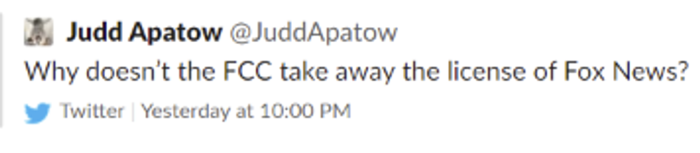 On Saturday night, Apatow wrote on Twitter, "Why doesn't the FCC take away the license of Fox News?"