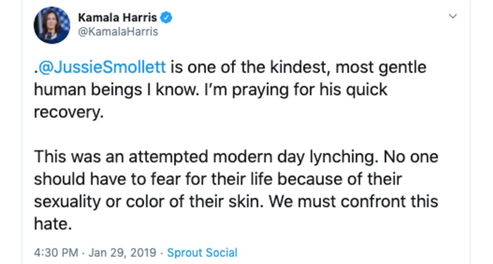 In a 2019 tweet, Harris wrote that Smollett "is one of the kindest, most gentle human beings I know. I'm praying for his quick recovery."
