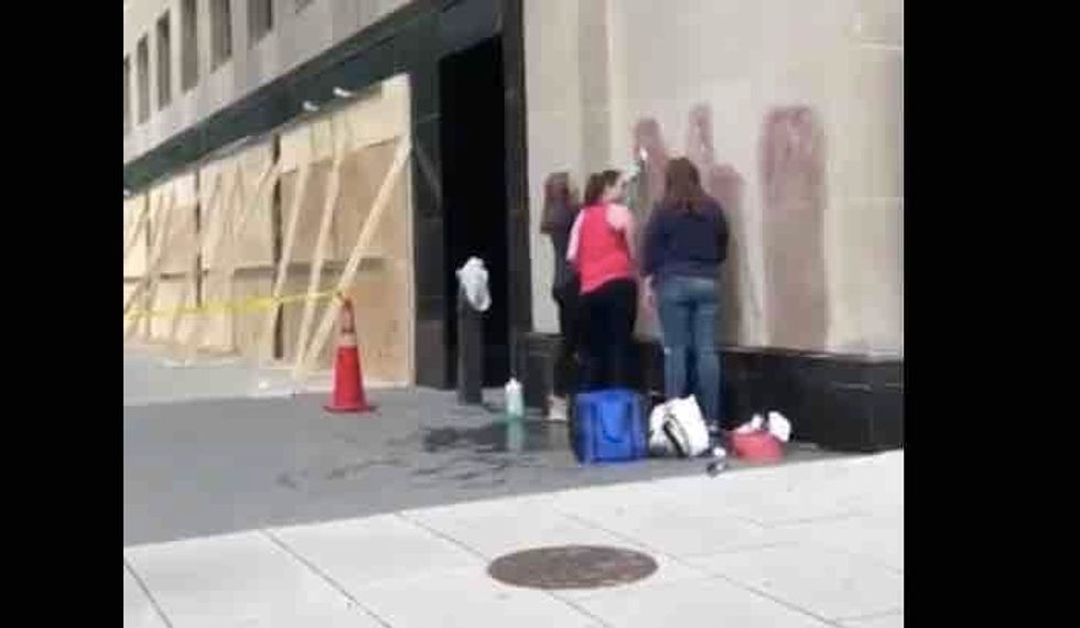 "We don't disagree with the message, ma'am, it's just on the building," one of the deplorables replied. "We're just trying to clean it."