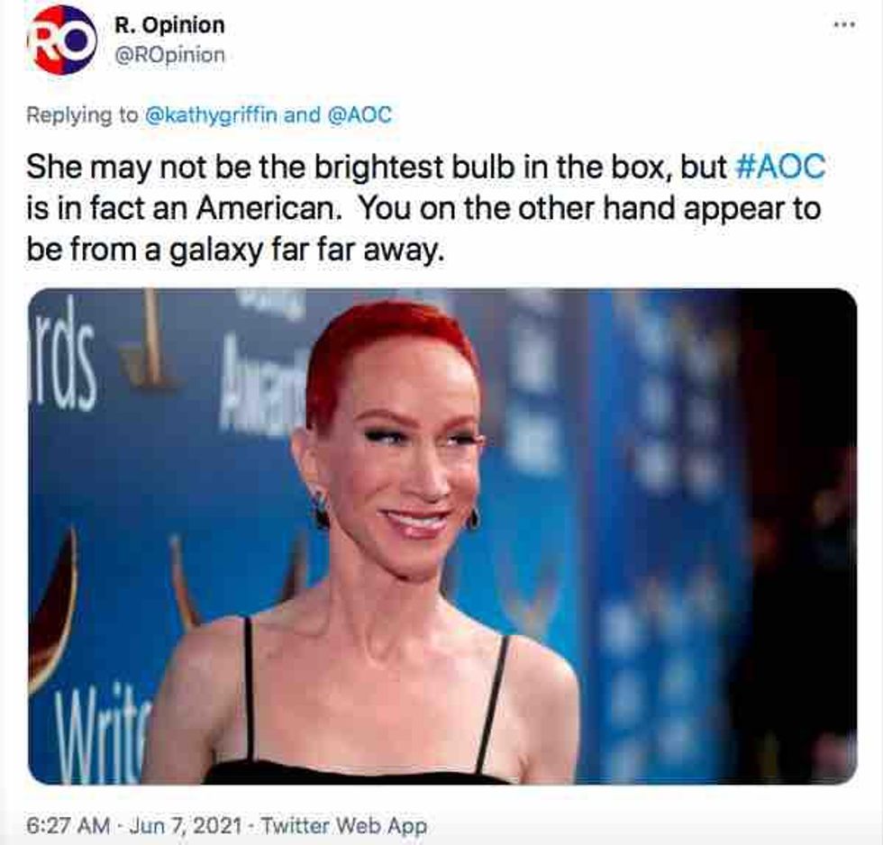 Far-left comedian Kathy Griffin was berated on Twitter after she appeared to imply that Democratic U.S. Rep. Alexandria Ocasio-Cortez of New York is not a United States citizen.
