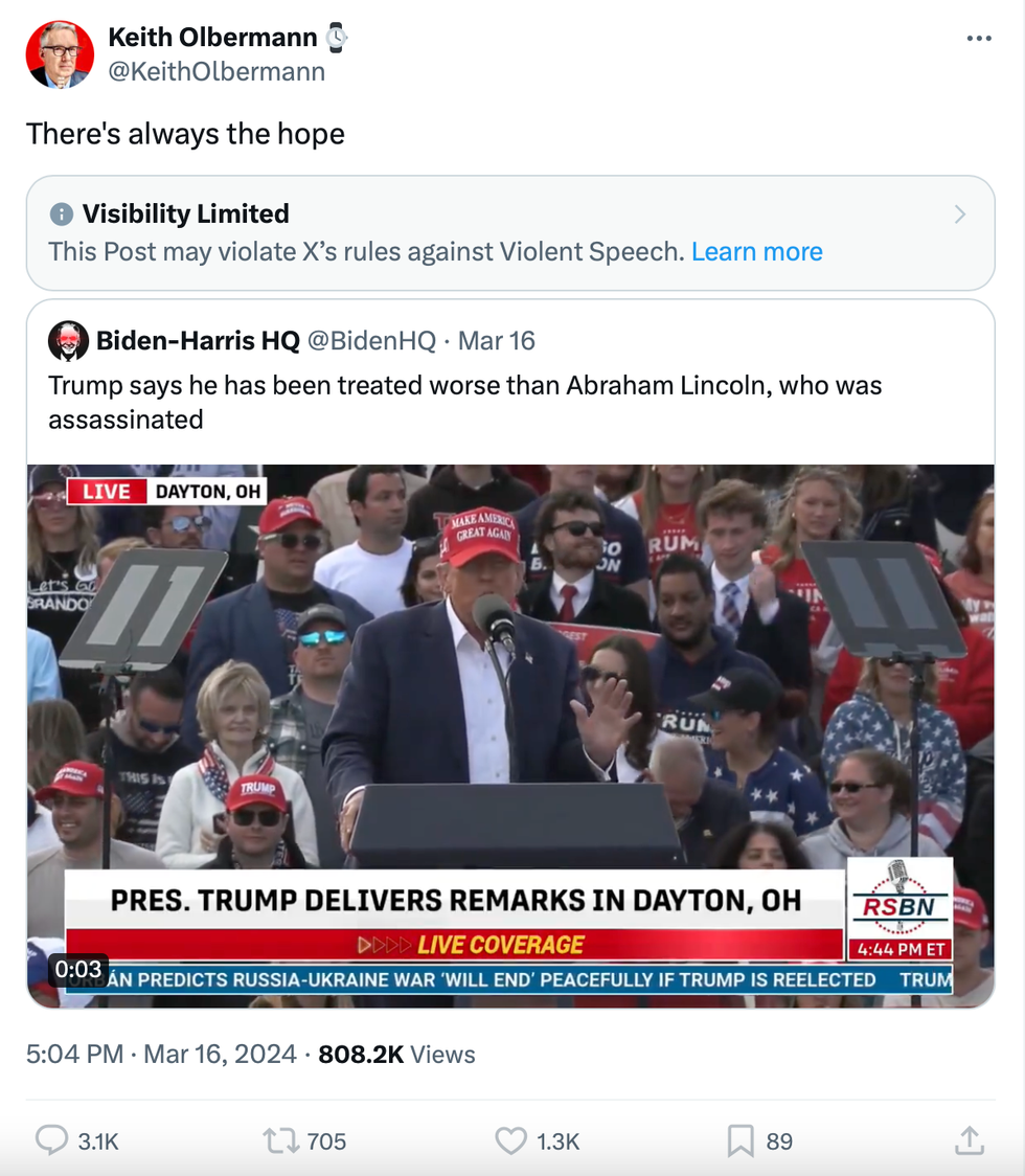 UPDATE, 8:29 p.m.: X on Monday noted that the visibility of Olbermann's post was limited due to the platform's rules against "violent speech."
